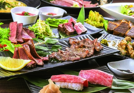 黒毛和牛大トロ炙り握り寿司や自家製黒毛和牛ローストビーフ、料理長おまかせステーキ2種など、全7品の人気肉料理が楽しめる。プラス1620円で70種飲み放題付きに。(コースはその日の仕入れ状況によって内容変更になる場合もあり)