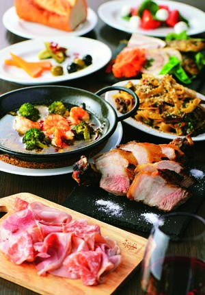 鹿児島県産・茶美豚(チャーミートン)のスペアリブのロースト、エビとキノコのアヒージョ、アンティパスト盛合せ、自家製ピクルスとオリーブのマリネ、パンの全8皿。茶美豚はJA鹿児島から直送、甘みがあり脂はあっさりとしているので女性にも人気の逸品。