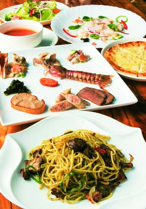 前菜9種にカルパッチョ、スープ、サラダ、パスタ、ピザが2000円コースの基本。この日は自ら獲った穴子に手長タコ、シャコ、幸貝と呼ばれるテングニシなどを使用。パスタの一番人気はバジリコだが、他のパスタやリゾット、ドリアに変えるなど、柔軟に対応してくれる。自家製ベーコンなど、魚以外の食材にもこだわっている。