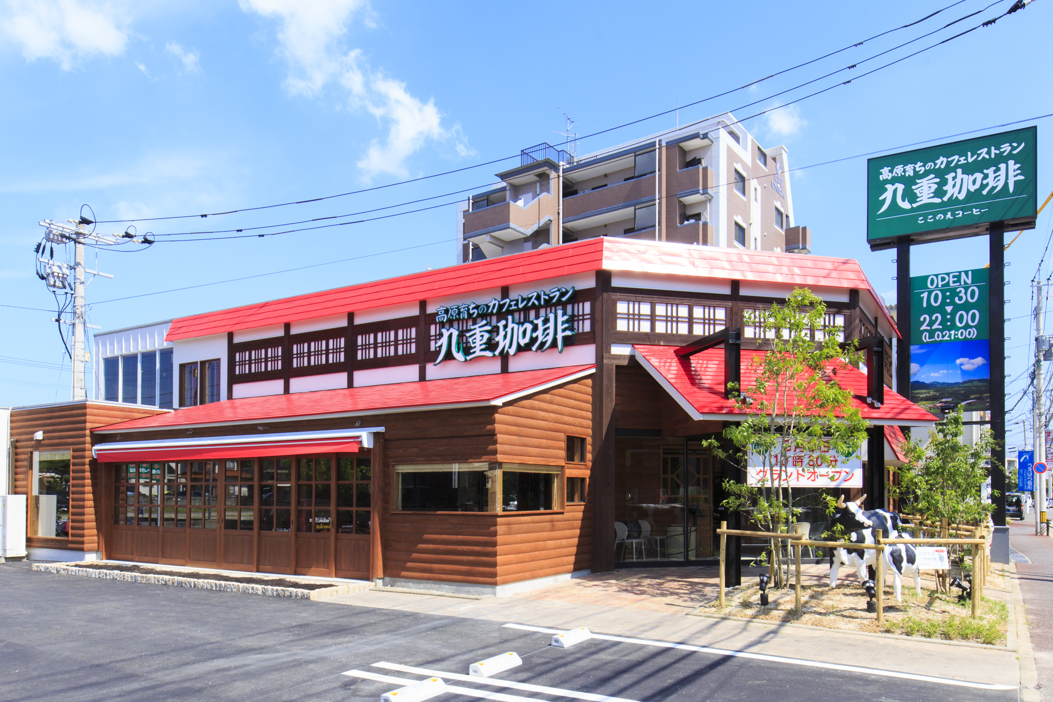 西長住の街中に現れた赤い屋根の山小屋風建物と牛のオブジェが印象の『九重珈琲』が8月9日にOPEN!!“大分県九重町の魅力を届けたい”という想いから生まれた自然派レストラン。野菜・水・肉・卵・牛乳などを現地から直送し、大自然が育んだ食材の美味しさを洋食メニューやデザートでも楽しめる。高原のレストランをイメージして木を基調に作られたお店は、開放感のある1階、ソファ席が充実した2階とオシャレでキュート♡