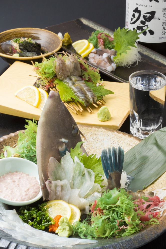 初めての人はまずここから食べてみよう!!肝ソースで味わう『皮はぎ姿造り』(1680円)、『たこおどり刺身』(680円~)、『幻の生シャコ刺身2匹』(580円)、『博多名物ごまさば』(680円)。
