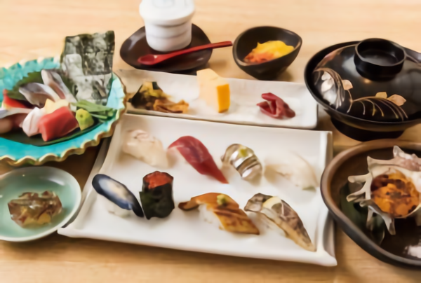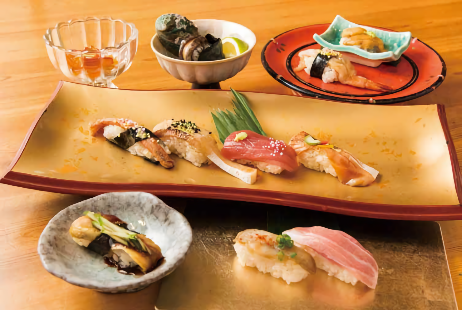 名物寿司の本マグロのトロ、一口アワビの踊り、国産ウニを含む全11貫が付く。本店にあたる中洲店と長浜市場などから共同で仕入れるネタ、昔ながらの赤酢を使うシャリなど老舗の伝統はそのままに、住宅街という立地柄、よりカジュアルに肩肘張らず寿司を楽しめることができる。