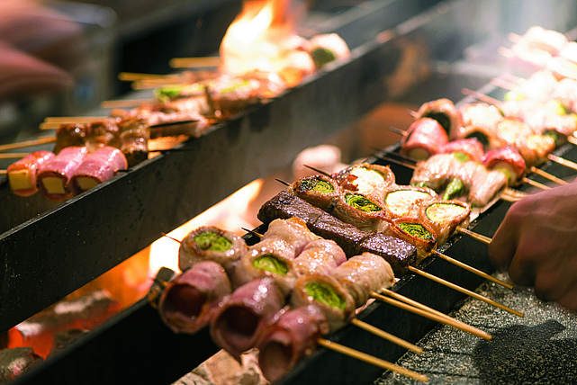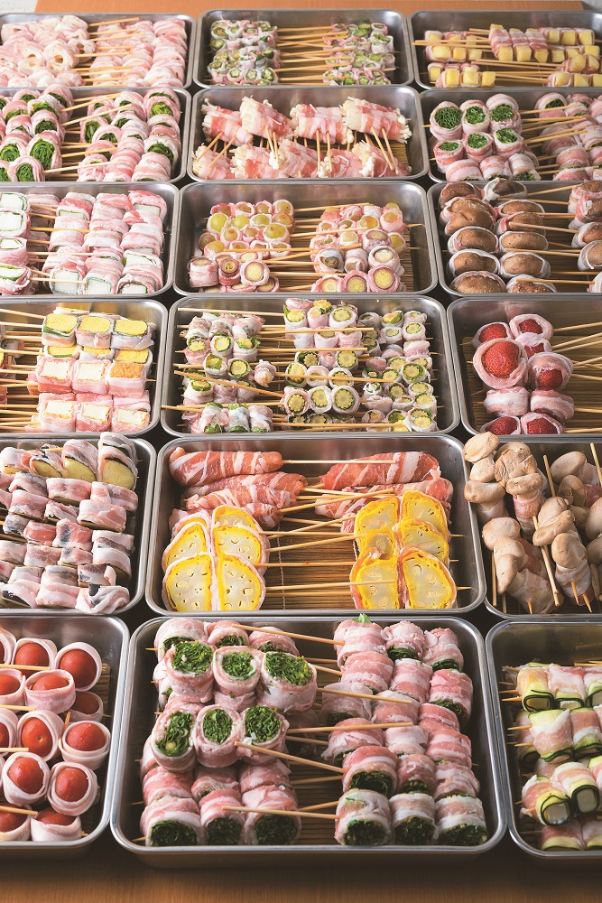 野菜巻き2本、博多焼鳥3本、本日の逸品