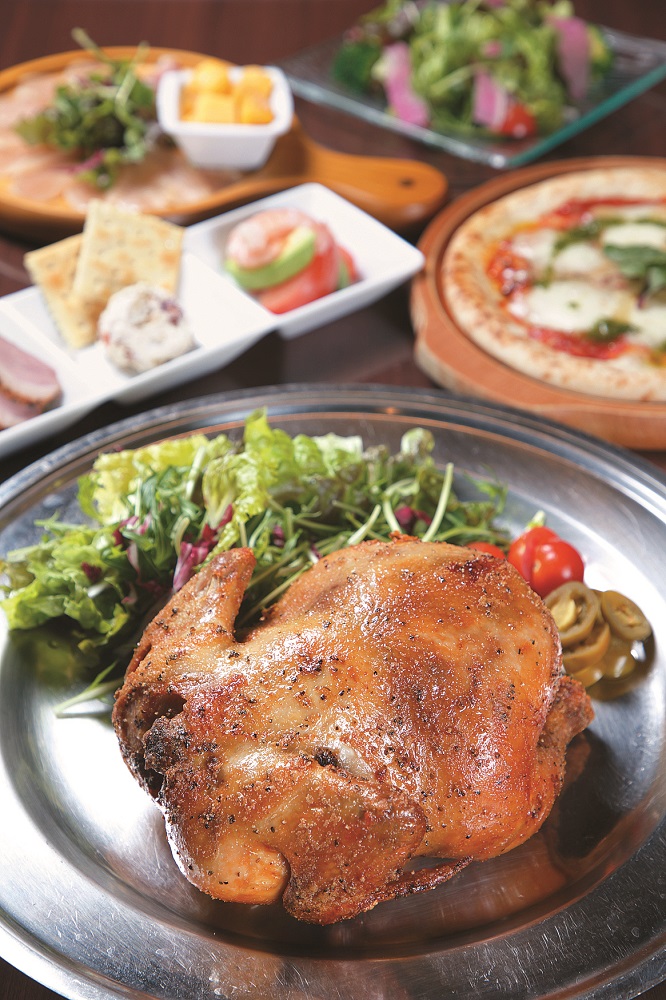 九州産野菜のサラダ、華味鳥生ハム盛り、本日のピザ
