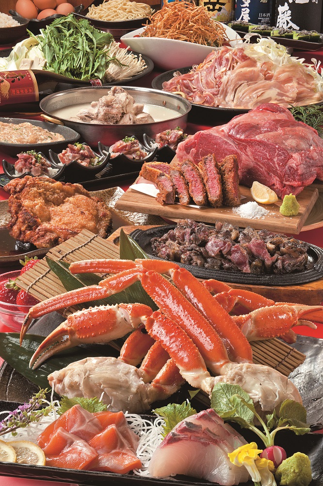 ズワイ蟹、国産牛のレアかつ、選べる鍋などがついた全10品。歓送迎会で利用してリピーターになるお客様も多いという。素材に限り、厳選したメニューだけをコースに取り入れた。10名様以上のご利用で1名様無料、30名様以上の利用で2名様無料。また、18時までに4000円以上のコース宴会スタートでプレミアム飲み放題にグレードアップ!詳しくはお問い合わせを