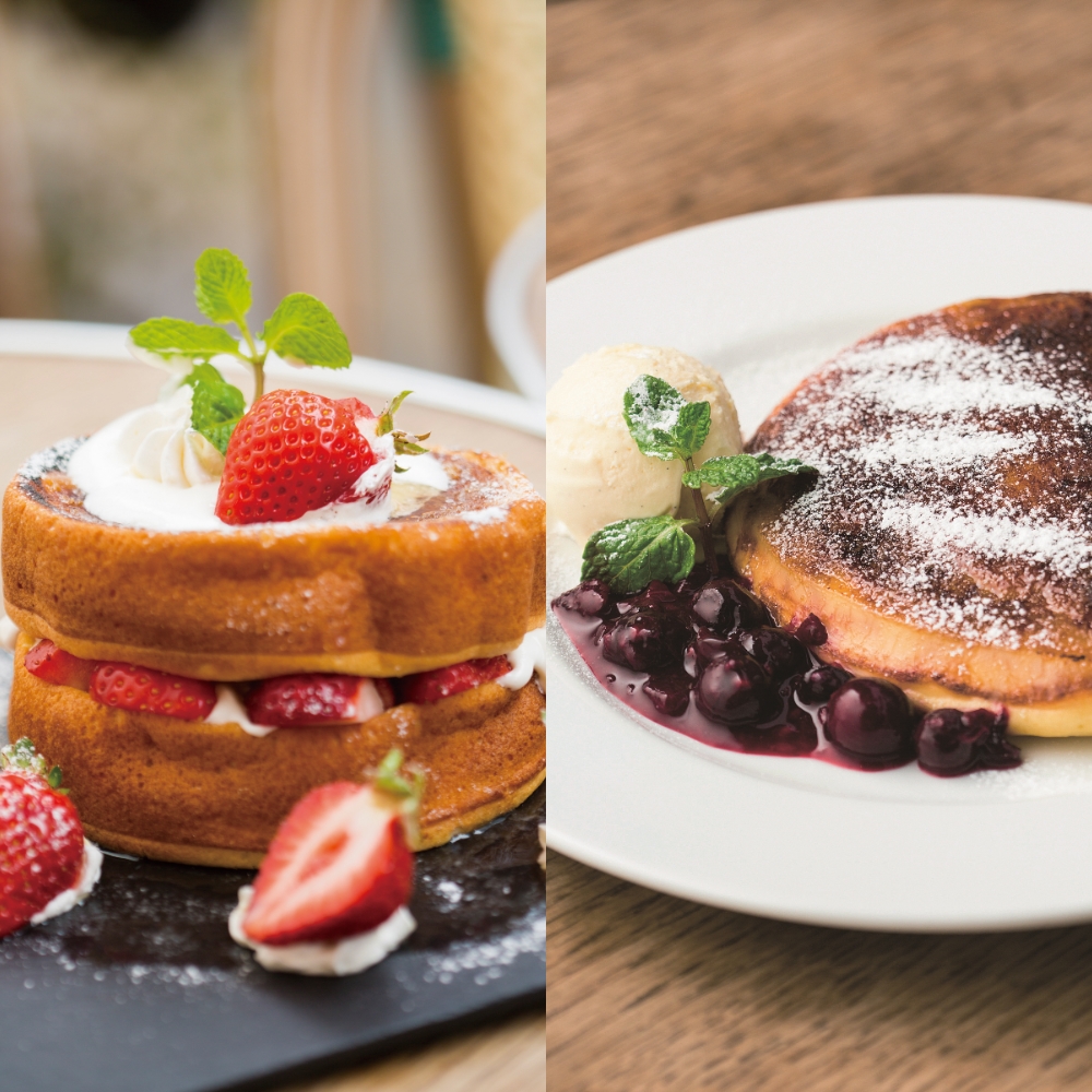 スタッフみんなでアイデアを出し合い完成したコマツの特製パンケーキ!一つ目の『あまおうパンケーキ』(1380円)は、メレンゲとリコッタチーズを使用し焼いたふわふわした食感が決め手!見た目は分厚いのに口に入れた瞬間、シュワッととろけるような口当たりがたまらない♪二つ目は、なめらかでしっとりとした、もっちり生地が美味しい『クレームブリュレパンケーキ』(1080円)は、しっとり&ふわふわパンケーキの上に、甘さ控えめな濃厚カスタードをかけて表面を焦がした、ほろ苦くかつ濃厚な味わい。バニラアイスをのせ、ブルーベリーソースをかけると、さっぱりした風味に!幸せな気分になれる新作パンケーキ、是非食べてみて♪