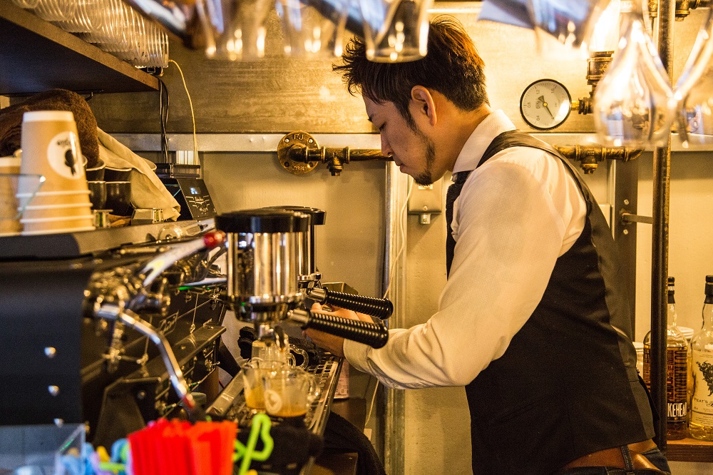 大名のある一角、青いネオン管と小さな扉が印象的な店。オーナーの伊東さんは4年前にラテアートに目覚め、バーテンダーと両立しながら独学。その後、1年足らずで日本大会にて優勝、香港とアメリカの大会では2位を獲得と、脅威の実績を持つ凄腕の持ち主。『クリームブリュラッテ』(650円)は温かいスウィーツとして、今まさにブームを巻き起こしている。“カフェ×バー”の新しいスタイルから生まれた、特別な一杯をぜひ味わって!