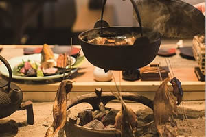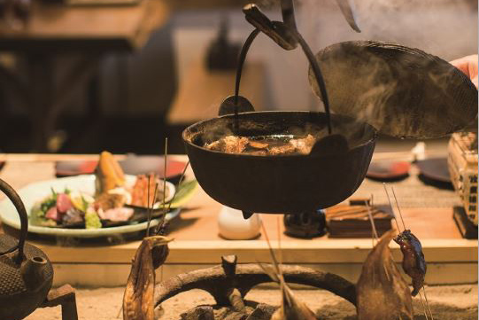 囲炉裏端の温もりと美味に心が解きほぐされる。